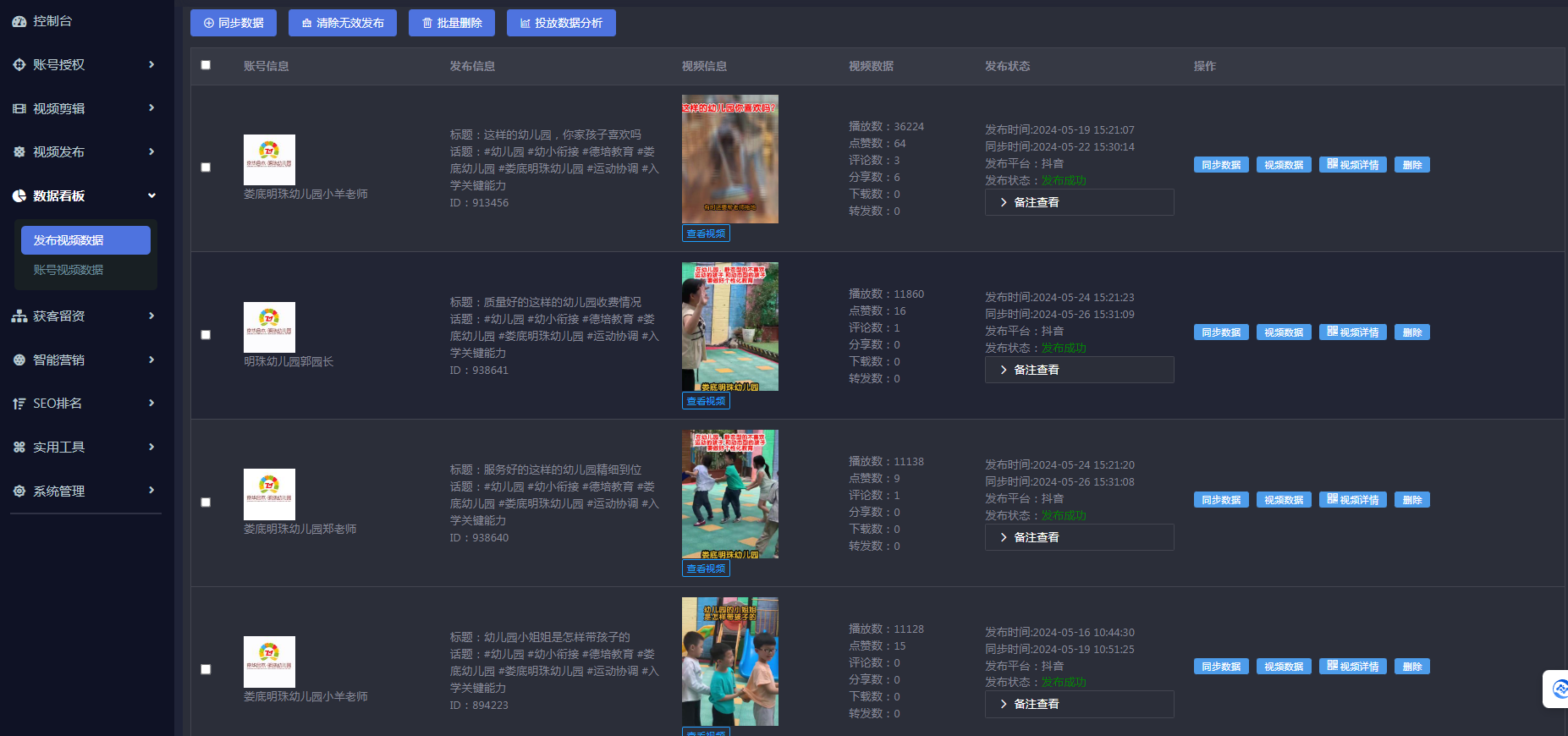 娄底明珠幼儿园就是通过抖去推员工矩阵功能,让员工将抖音账号统一授权绑定至抖去推后台,由专门的运营人员定期进行素材收集,上传,更新,并将批量剪辑好的视频进行定时发布至各个账号上。对员工来说,不需要耗费太多时间和精力就能完成工作要求,此外还能为自己带来业绩。对商家来说,即使一个员工每天的播放量只有300-500之间,但胜在以量取胜,积少成多。20个账号每天的播放量能达到1万+,甚至还会出现爆款视频。